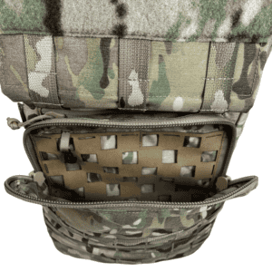 GP Compartment: The GP Compartment is large enough to fit 1x 200 round saw drum and a waffle shirt (or similar volume item). There are 2 rows of internal elastic loops to organized  your items for quick access at in low light/no light. In the upper left corner there is glove hook to secure sensitive items.  Externally it has 9×3 MOLLE for attaching the optional Helmet Flap, Horizontal 5x40mm pouch or any other MOLLE compatible item.  There are 2 grommet in the bottom of the compartment for drainage that have a secondary functionality when used in conjunction with the 2 drain holes in the main compartment can be used for a dynamic cinch strap for securing light loads to the bottom of the pack like wet weather gear, ponchos, patrol Ghillies or other similar items.